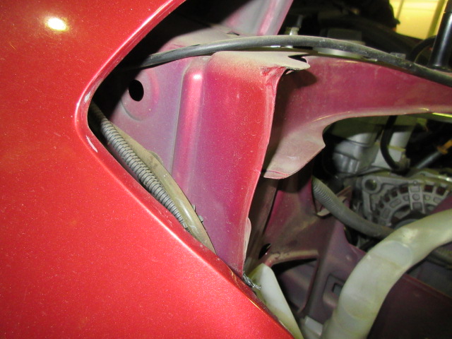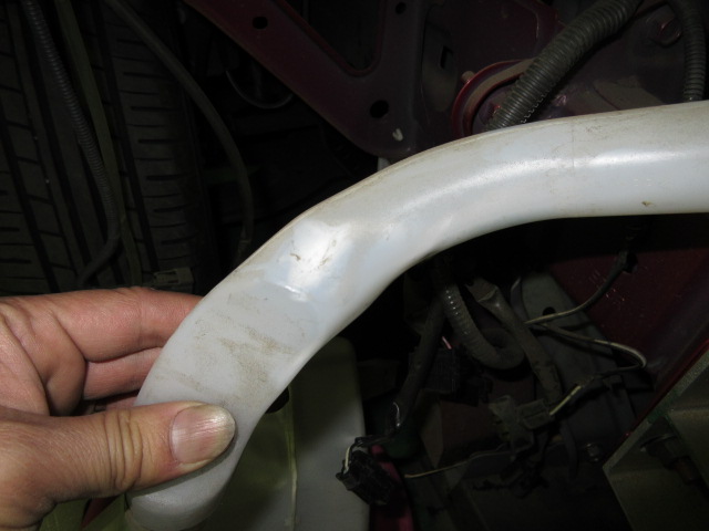 ↑バンパー裏には ワイパーの時に使う水 ウインドウオッシャータンクがあります。それが損傷を受けていますので・・・ タンク交換です。