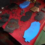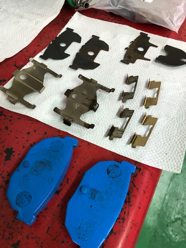 そして 部品が到着するまで ブレーキディスクの錆止めや ブレーキパッドも真っ黒でしたので パッドも元々の色の近似色にて 塗装 見栄え良いでしょ!? パッドの減りが均等でないのが少し気になりますが 今まで 上手くスライドピン等が動いていない事を考えると ありえる事なので ここは様子見で パッドの位置を変更して対処する
