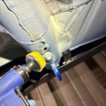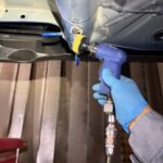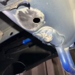 これは ボディ下面の床 いわゆるフロアパネルを凹してしまった ということでの鈑金作業