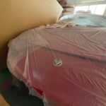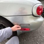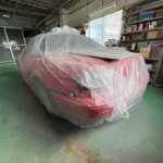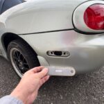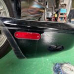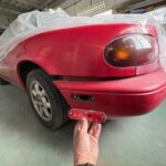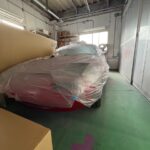 ↑現在修理中の バンパー交換のお客さんのバンパーを確認すると 赤・・・